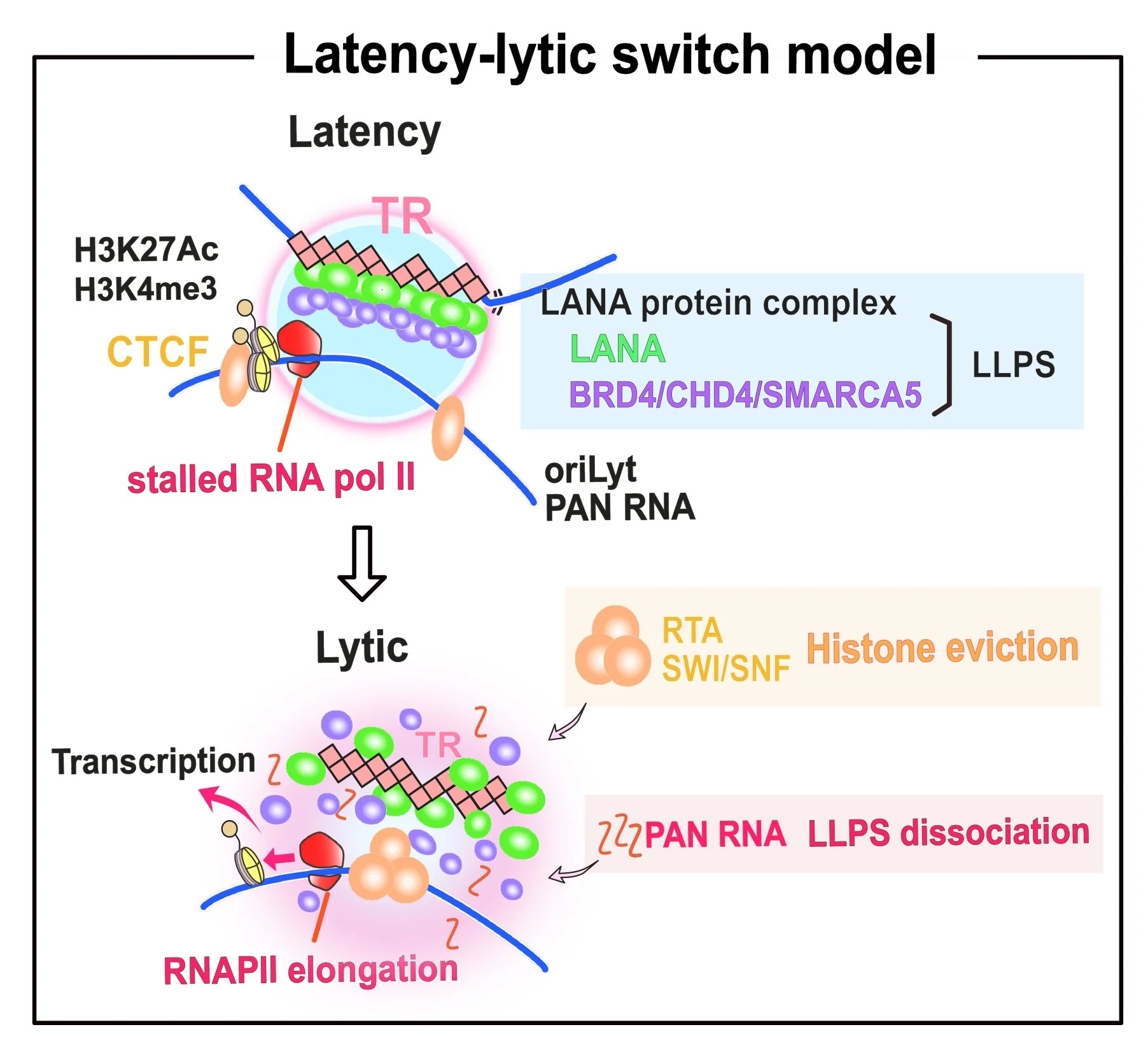 KSHV episome is approximately 150 kb, and persists in infected cells as a circular genome (episome). KSHV chromatin, like a host cell chromosome, is modified by the host histone enzymes. We study who is responsible for bringing such enzymes to the viral chromatin and how the enzymes continue to stay on the viral genome. We also study the association of the inflammatory cytokines produced by the infected cells and in the local microenvironment with epigenetically active latent chromosome maintenance. Our studies have led to the identification of critical epigenetic enzymes and their role in latent infection. Identification of the recruitment sites of these key enzymes suggested transcription functions of terminal repeats. We focus on the model in which the KSHV terminal repeat region is a "super-enhancer" for lytic gene promoters (a unique region of the KSHV genome). Because the enhancer often determines the frequencies and duration of transcription at promoters, we think studying the KSHV "super-enhancer" regulation is critically important for understanding of the KSHV replication cycle.